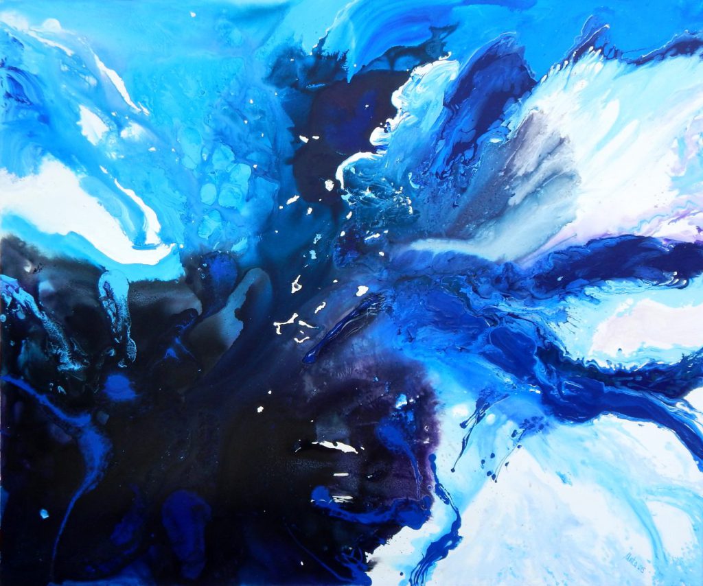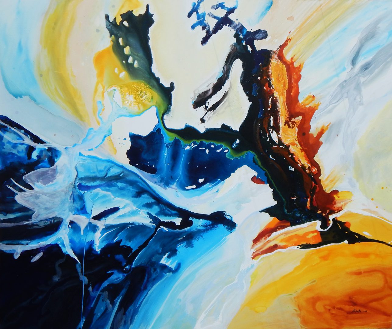 Claro que es una conexión o investigación de los mundos interiores con el mundo que se intuye y también con el mundo real y cotidiano. Al fin resulta ser un mundo personal que ofrezco al ojo del observador y de su nivel y experiencia espiritual. Ese mundo personal presentado en manera visible o pictórica ha tenido conexión con los sueños y también con el gran maestro: la misma naturaleza. En él también está involucrada la mitología y la poesía, con el gran espíritu y el cosmos, en la medida de lo posible. Es mi propia conexión con el mundo figurativo y lo que se percibe a primera vista, pero podría decir que lo que más me define es lo más abstracto, lo cual considero como una aventura energética sin fin. Experimento lo espiritual y el viaje cósmico sublimado en la pintura abstracta como mi cara interior o, tal vez la menos visible a la primera impresión. Si se pudiera definir ese experimento y viaje espiritual en forma física o visible sería una mezcla de varios estilos pictóricos como Abstract painting o abstracto lírico, Action painting y El informalismo o Art Informel y, al mismo tiempo, con la base del Sumie (que es una de las disciplinas o prácticas del Budismo Zen) y por eso lo llamo estilo de la pintura energética o, entre comillas, “Salvajismo pictórico”. Claro que se podría decir mucho más, pero como dije, no es el momento adecuado.