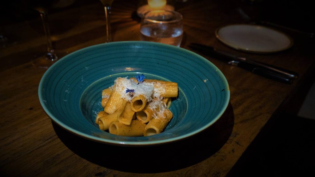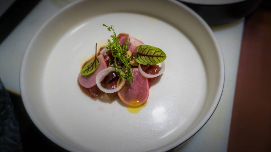 La entrada fue un sashimi de atún aleta azul, rábanos y chips de chaya junto con vino blanco albariño, seguidos de una lechuga a la parrilla, beurre blanc de gorgonzola, chícharos y nueces. Como tercer tiempo, Abascal nos sorprendió con un spicy vodka rigatoni con erizo y queso pecorino.
