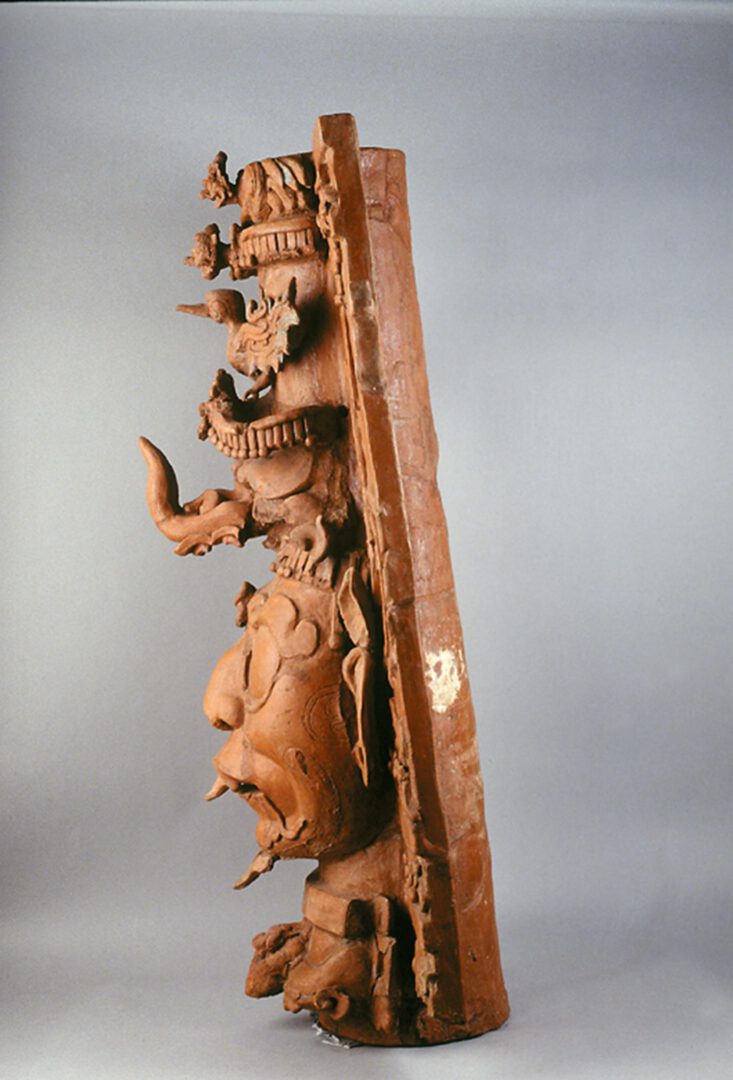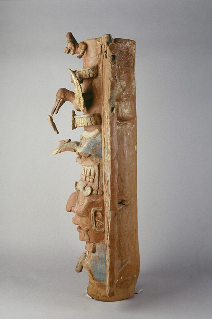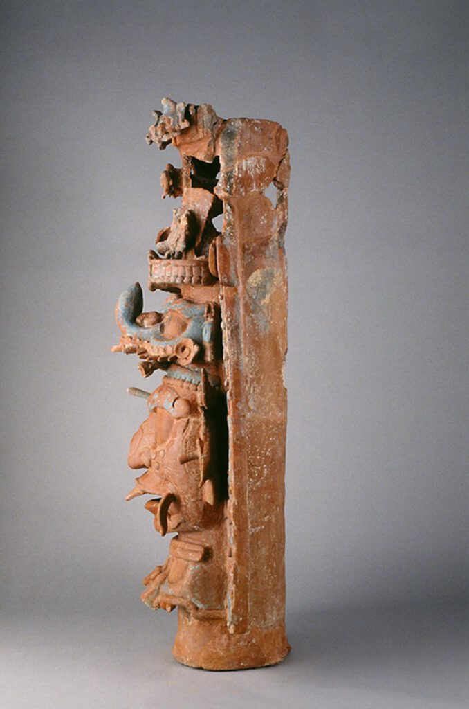 Los incensarios efigie, modelados en barro, se componen de un cuerpo tubular al que adosaron dos secciones planas con decoración simétrica (llamadas aletas) que corren pegadas en el eje vertical del cuerpo; en la parte superior se colocó un brasero donde se quemaban las resinas vegetales y -muy probablemente- sangre humana. Sobre el pedestal se representaron una gran variedad de motivos iconográficos, el más importante es el rostro de dioses o antepasados, los cuales están delimitados en la parte inferior por el mascarón de la Serpiente Acuática (ser sobrenatural que se vincula con el nivel acuático e infraterrestre), en tanto que encima del mascarón central de las deidades o antepasados se despliegan una serie de mascarones de seres sobrenaturales, diademas y aves que -a manera de tocado- indican los ámbitos de acción de los seres sagrados.