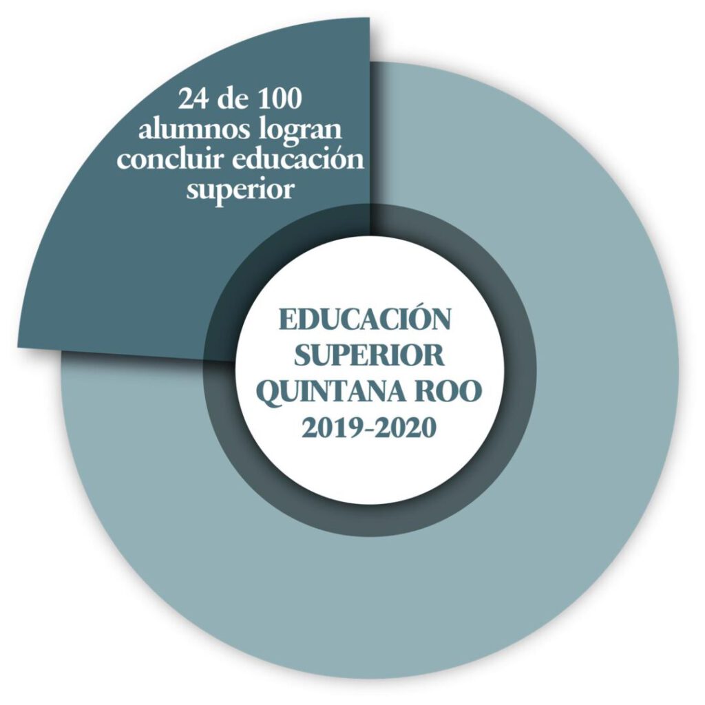 Educación: El informe de las “Principales cifras del sistema educativo nacional 2019-2020”, muestra que en Quintana Roo apenas 24 de cada 100 alumnos logran terminar la educación superior. El promedio nacional de escolaridad en el país se ubicó en 10.1 años durante el último trimestre de 2018, lo que implicaría un nivel equivalente al primer año de preparatoria y, según datos del Inegi, Quintana Roo se encuentra en ese mismo nivel; jóvenes y adultos que en su mayoría apenas han concluido un año de bachillerato.