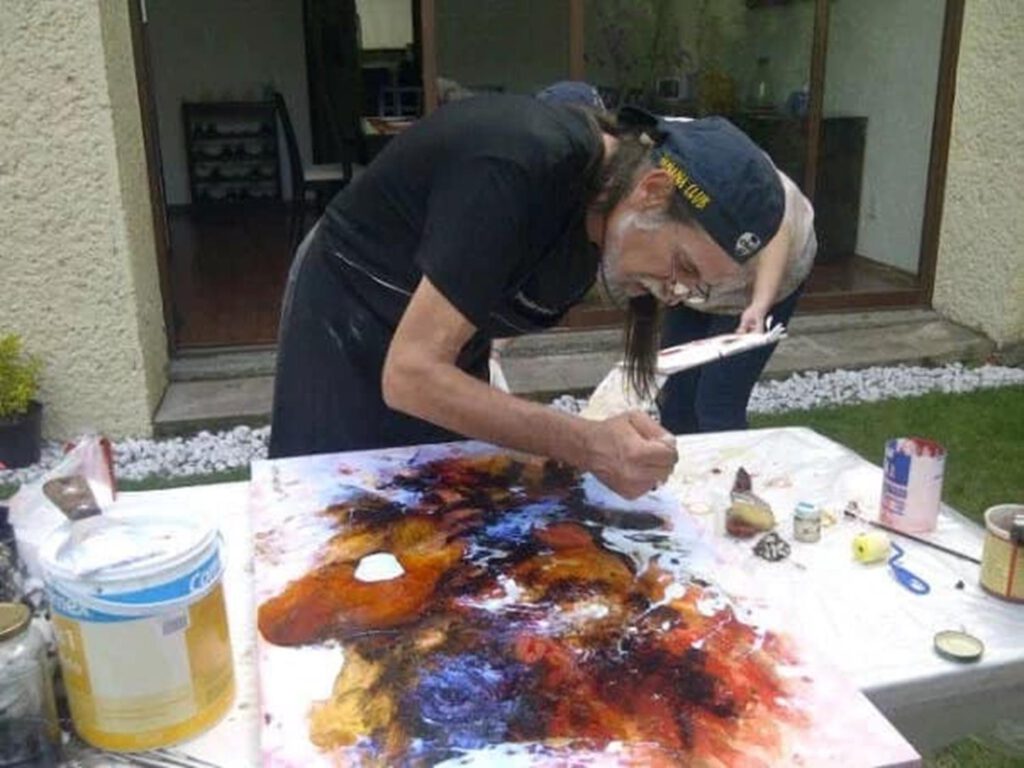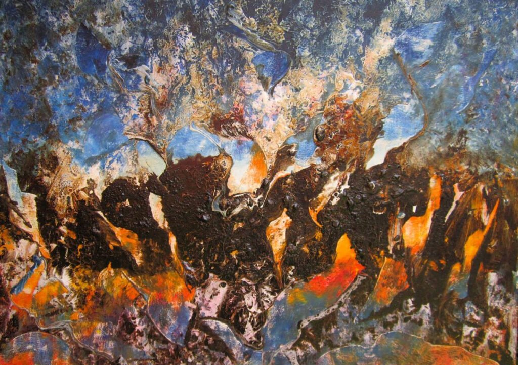 Claro que es una conexión o investigación de los mundos interiores con el mundo que se intuye y también con el mundo real y cotidiano. Al fin resulta ser un mundo personal que ofrezco al ojo del observador y de su nivel y experiencia espiritual. Ese mundo personal presentado en manera visible o pictórica ha tenido conexión con los sueños y también con el gran maestro: la misma naturaleza. En él también está involucrada la mitología y la poesía, con el gran espíritu y el cosmos, en la medida de lo posible. Es mi propia conexión con el mundo figurativo y lo que se percibe a primera vista, pero podría decir que lo que más me define es lo más abstracto, lo cual considero como una aventura energética sin fin. Experimento lo espiritual y el viaje cósmico sublimado en la pintura abstracta como mi cara interior o, tal vez la menos visible a la primera impresión. Si se pudiera definir ese experimento y viaje espiritual en forma física o visible sería una mezcla de varios estilos pictóricos como Abstract painting o abstracto lirico, Action painting y El informalismo o Art Informel y, al mismo tiempo, con la base del Sumie (que es una de las disciplinas o prácticas del Budismo Zen) y por eso lo llamo estilo de la pintura energética o, entre comillas, “Salvajismo pictórico”. Claro que se podría decir mucho más, pero como dije, no es el momento adecuado.