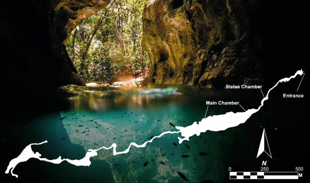 La “Cámara de las Estelas”, ubicada 500 metros al sur de la entrada de la cueva, se encuentra sobre una saliente de 10 metros de altura, situada frente al paso principal del arroyo. En el centro de esta cámara los antiguos mayas erigieron dos estelas o monumentos que se mantenían en una posición vertical gracias a varias estalagmitas y estalactitas rotas. Ambas estelas están hechas de grandes fragmentos de pizarra que probablemente se labraron en otro sitio y posteriormente fueron introducidos a la cueva. En una de las estelas los mayas tallaron nueve muescas en cada lado, lo que da al monumento una forma que se asemeja a la espina de una raya. La otra estela de pizarra se estrecha hacia una punta en el extremo superior del monumento, dando la apariencia de una navaja de obsidiana puntiaguda. Las espinas de raya y las navajas de obsidiana eran los principales instrumentos utilizados por los antiguos mayas en los rituales de autosacrificio, que consistían en perforar orejas, lengua y pene para recolectar las gotas de sangre en papel de corteza, el cual después se quemaba como ofrenda dentro de grandes vasijas.