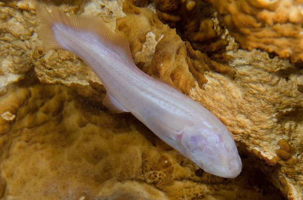 Finalmente, si aprende uno a bucear en caverna y se aleja del cuerpo abierto del cenote para adentrarse en los túneles de oscuridad perpetua, con suerte se puede encontrar a las dos especies de peces cavernícolas de la península de Yucatán: la dama blanca y la anguila ciega. Ambos carecen de ojos y son totalmente blancos, sin pigmento; la falta de visión la suplen con poros y papilas muy sensibles a lo que se mueva en el agua. Ambos se consideran amenazados de extinción, sobre todo por la contaminación del agua, de modo que es una buena noticia que el transporte principal de la región sea pronto un tren eléctrico y no tantos vehículos automotores, aunque desde luego será crucial también limitar la expansión urbana y cuidar la disposición de aguas residuales.