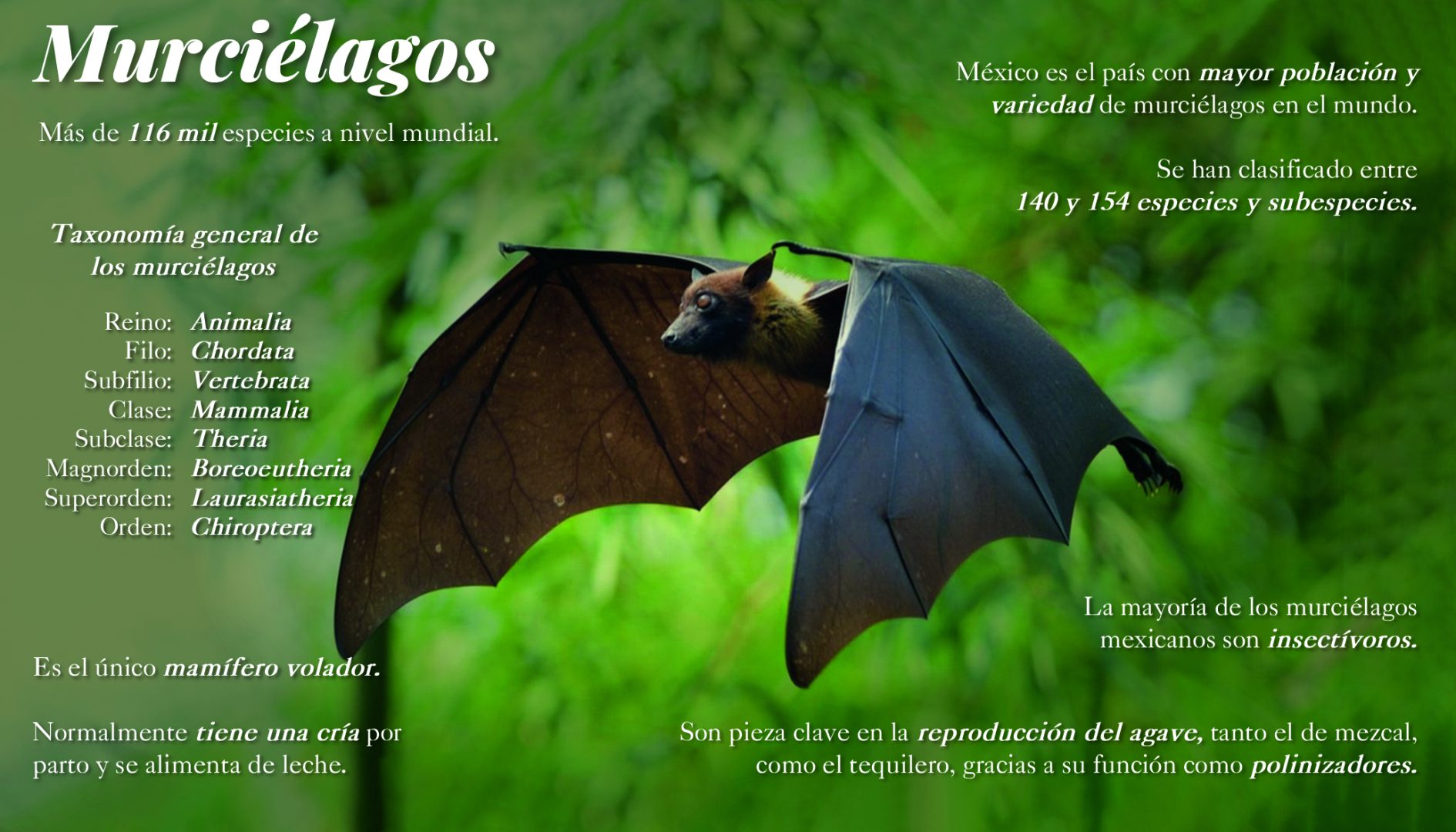 En términos taxonómicos, a nivel mundial se han descrito alrededor de mil 116 especies (Simmons, 2005), de las cuales cerca de 140 se distribuyen en México (Medellín, 1993; Ceballos et al., 2005; Medellín et al., 2008). Sin embargo, hace 45 años, Bernardo Villa Ramírez publicó la obra Los murciélagos de México, donde reporta 154 especies (Villa Ramírez, 1966).