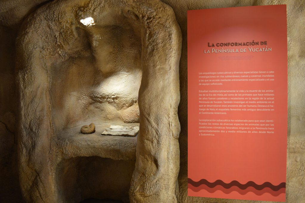 En este espacio, el visitante puede adentrarse en la recreación de los paisajes kársticos sumergidos, específicamente de una cueva inundada, en la que se muestra cómo se formó la península de Yucatán y cómo se ha transformado con el paso del tiempo, incluyendo la aparición de la mega fauna del período Pleistoceno, ejemplificada con un tigre dientes de sable, un perezoso gigante y un gonfoterio: mamífero emparentado con los mamuts y los elefantes actuales. Estos animales convivieron con los primeros humanos que habitaron la región, por lo que aquí se muestra el hallazgo de Naia, una joven mujer cuyo esqueleto fue encontrado en la cueva sumergida Hoyo Negro, cerca de Tulum, que es considerada como uno de los individuos más antiguos de América.