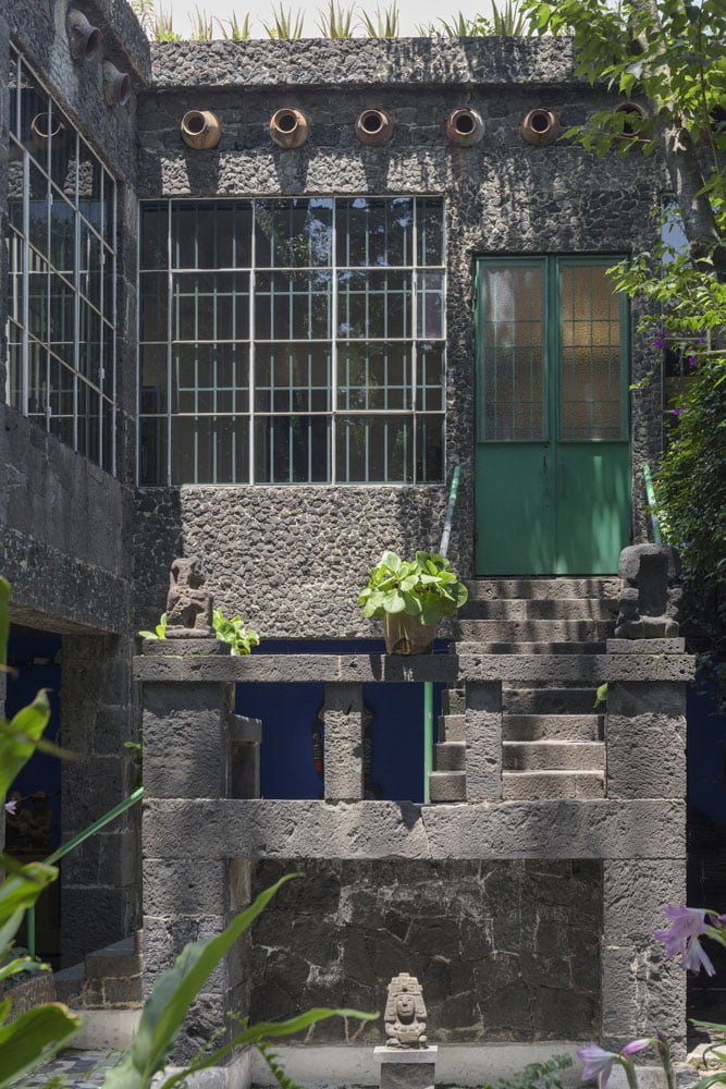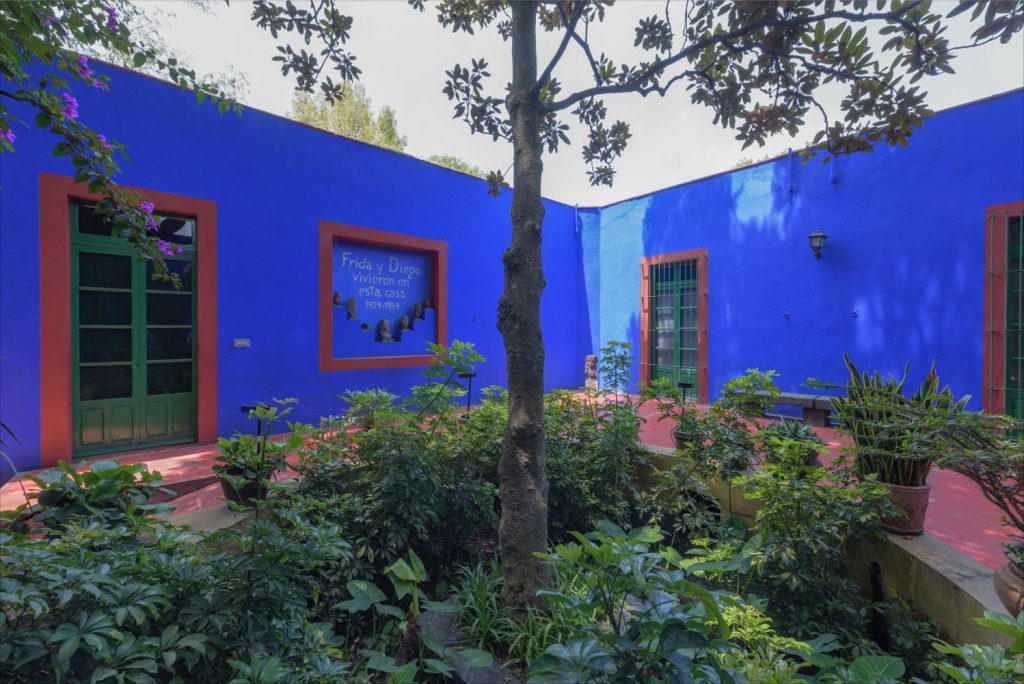 Los exteriores del Museo Frida Kahlo son tan atractivos como sus espacios internos, fundamentalmente debido a dos cualidades especiales: el color azul cobalto de sus muros y su exuberante jardín. Construida en 1904, sabemos que la residencia inicialmente era de color amarillo pálido, un tono bastante ocupado en los muros de las casas mexicanas de comienzos del siglo XX.