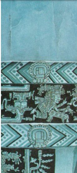 Las dos montañas que conforman la escena, sirven como contención de un cuerpo acuático que bien podría tratarse del mar Caribe, pues se aprecian una raya y un pez nadando en sus aguas. Estos elementos podrían ser una metáfora de la emergencia del maíz y los humanos de la superficie de la tierra (ibídem); siguiendo al autor, “[en] Tulum, este evento mítico de emergencia se repite diariamente cuando el sol, con los dioses y los ancestros, se eleva desde el Camino Florido de las aguas orientales del mar Caribe” (op cit: 179).