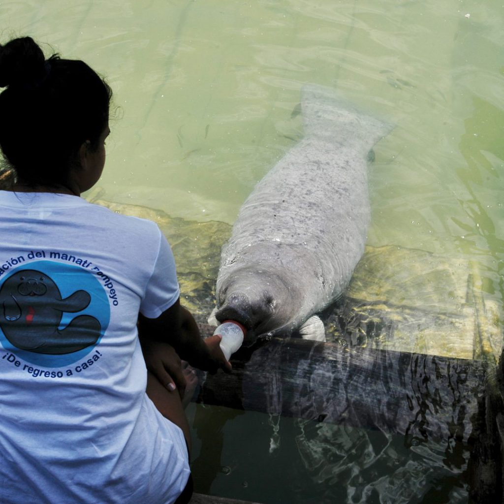 Pero no todo son noticias tristes. En Laguna Guerrero, en el sur del estado, se encuentra el Centro de Atención y Rehabilitación de Mamíferos Acuáticos (Carma), del Ibanqroo, donde habita temporalmente Pompeyo, un manatí huérfano, rescatado cuando tenía apenas unas semanas de nacido. Pompeyo ha respondido muy bien a nuestro protocolo de rehabilitación, durante muchos meses lo alimentamos con mamila con una fórmula láctea especial, y actualmente su dieta es completamente sólida: algas cosechadas de la misma laguna y lechugas.