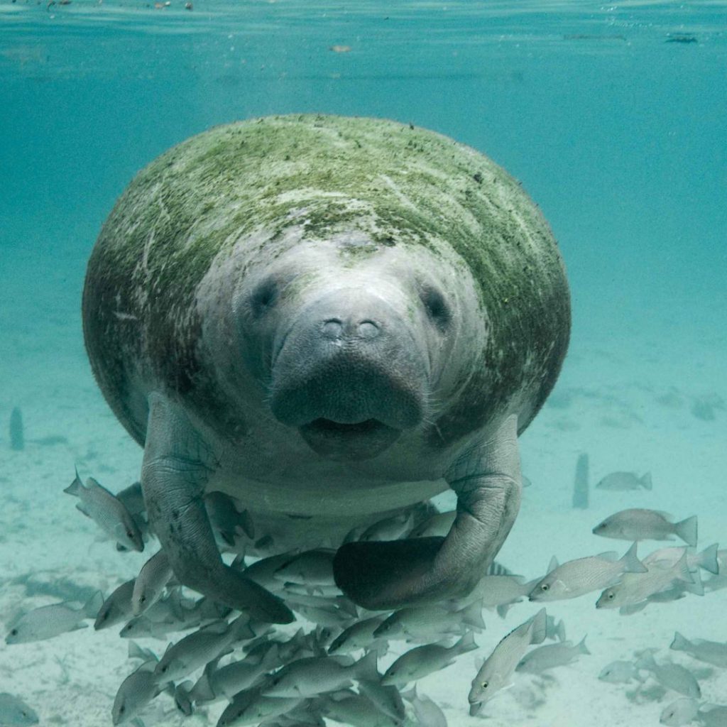 Los manatíes se consideran parte de la megafauna acuática, pues llegan a alcanzar hasta cuatro metros de largo y 500 kilogramos de peso en edad adulta. Ellos, junto con sus primos los dugones, son los únicos mamíferos herbívoros que son completamente acuáticos.